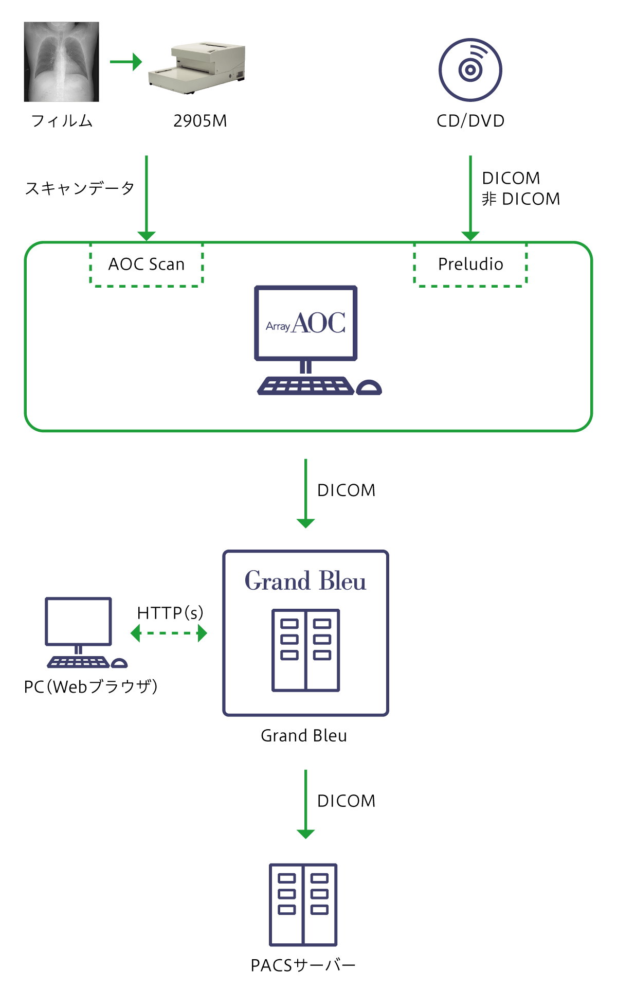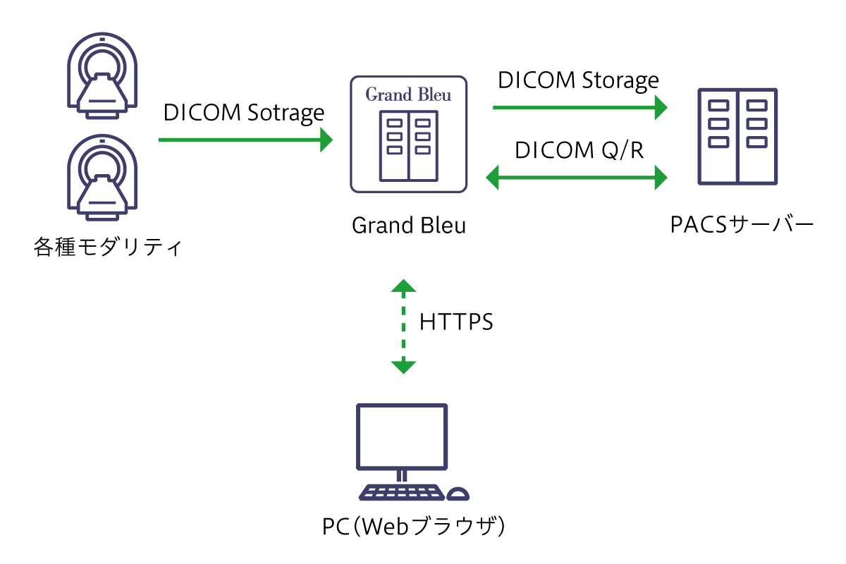 Grand Bleuは、webベースのシンプルなテンポラリーPACSです。 セカンドPACSや地域連携で画像を参照するためのPACSとしても最適です。 また外部からインポートした画像を一時的に保管して、必要なものだけを選択してメインPACSに送るための専用機能があります。